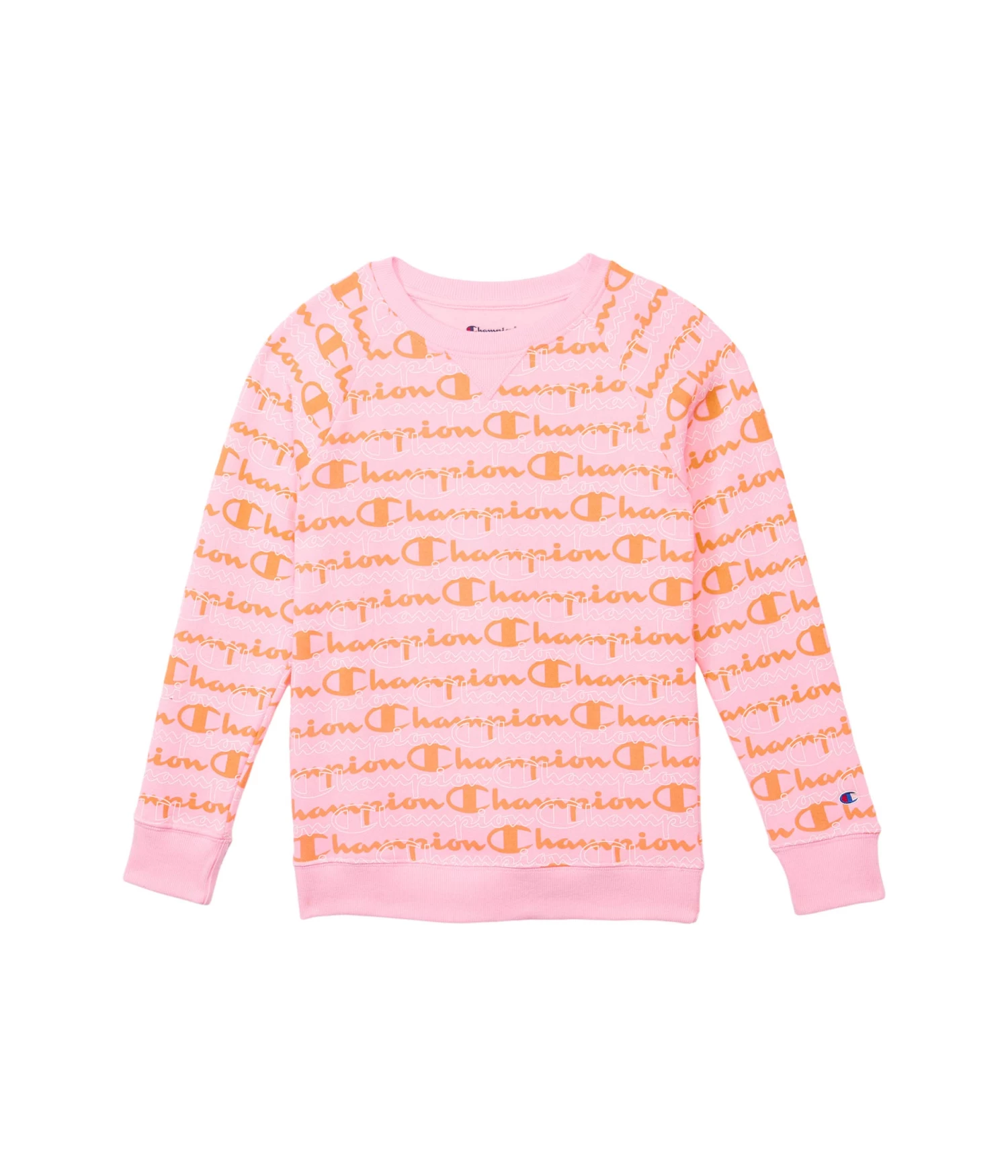 - Crafted for fashion and comfort this Champion® Kids Aop Layered Script Fleece Crew sweater features a rounded neckline, multi-color Champion logo pattern design, long sleeves with solid color cuffs, and a straight hemline.