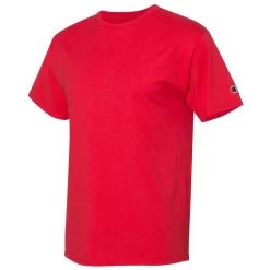 A good t-shirt is a must have and a custom logo just adds to the effect. Champion Men’s Athletic Red Premium Fashion Classics Short Sleeve T-Shirt offers a comfortable look and feel. Available in a wide range of colors, the 100% ringspun cotton jersey t-shirt can be customized with a company logo or heat transfer of your choosing. Perfect as every day wear, employee apparel, or even as sportswear, these short sleeve t-shirts are a must have for every wardrobe. The Champion logo appears on the sleeve as a sign of quality. Place your order today with the design of your choice.