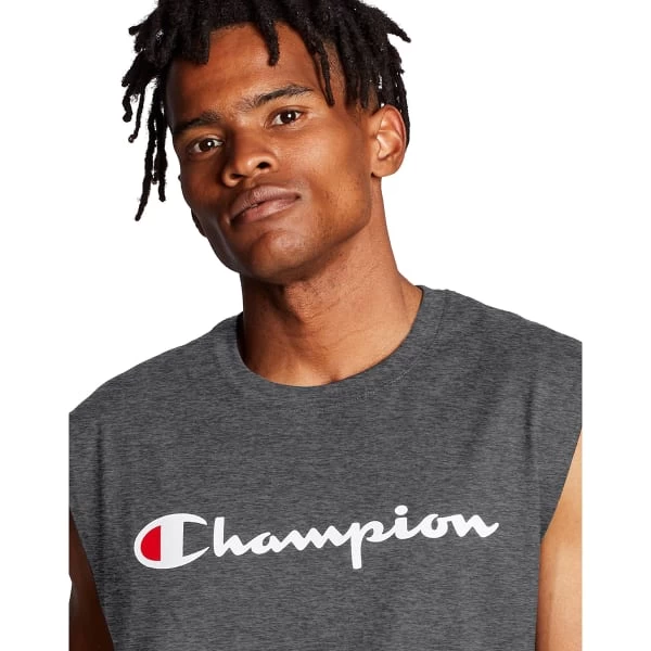 Get a workout partner that packs a punch. This Muscle Tee delivers all the quality detailing you expect from Champion athleticwear–from the soft ring-spun cotton to the sturdy back neck taping and doublestitched seams.