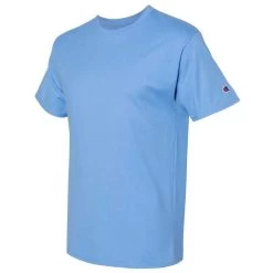 A good t-shirt is a must have and a custom logo just adds to the effect. Champion Men’s Light Blue Premium Fashion Classics Short Sleeve T-Shirt offers a comfortable look and feel. Available in a wide range of colors, the 100% ringspun cotton jersey t-shirt can be customized with a company logo or heat transfer of your choosing. Perfect as every day wear, employee apparel, or even as sportswear, these short sleeve t-shirts are a must have for every wardrobe. The Champion logo appears on the sleeve as a sign of quality. Place your order today with the design of your choice.