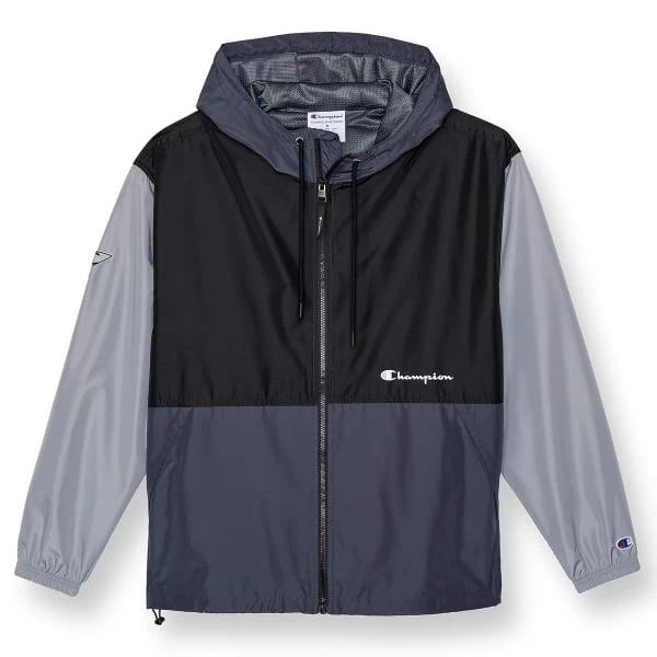 Different, bold color combinations to wear while out in the elements. Water and wind resistant with an adjustable hoodie. Drawcord and full-length zipper to fit needs. Welt side pockets for secure storage. Made with 100-percent recycled lightweight polyester fabric. Rubber badge champion script on left side of jacket with the iconic ‘C’ patch on the left sleeve.