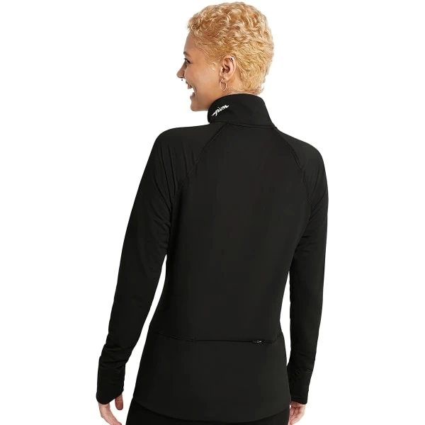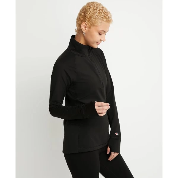 Own your look in our versatile half-zip. Built for high-intensity training, fabric wicks to manage moisture and odor for a drier, cooler wear. Soft, brushed interior keeps you comfortable while you move. Hidden waist zip pocket lets you bring essentials with you. Thumbholes keep sleeves in place to minimize distractions. Script logo at neckline shows off sporty style.